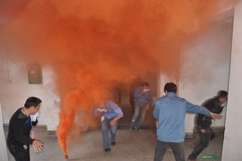 演練開始,信號組在得到演練命令后,立即發出火警訊號。同時在各個指定點放啟煙霧彈,樓梯道和走廊瞬間濃煙滾滾,各演練組在聽到逃生訊號后,在逃生組長的的組織下,迅速有序地從車間里往車間外疏散,每人用濕毛巾捂住嘴巴,彎腰匍匐前進,按規定的順序出了車間后分別從中線(沿樓梯道)和南線(沿走廊)繼續疏散,最后沖出煙區。救援組的人員跟隨疏散途中搶救了一名受傷人員(專人份演),在煙霧中,他們抬著擔架將傷員救出,到達指定地點集中,最后一名員工到達指定集合地點的時間是1分17秒。