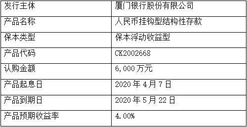 委托理財產品名稱:人民幣掛鉤型結構性存款CK2002668。