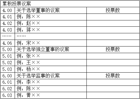 某投資者在股權登記日收盤時持有該公司100股股票,采用累積投票制,他(她)在議案4.00“關于選舉董事的議案”就有500票的表決權,在議案5.00“關于選舉獨立董事的議案”有200票的表決權,在議案6.00“關于選舉監事的議案”有200票的表決權。