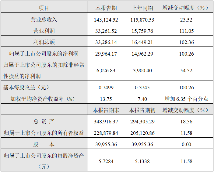 (3)報告期受益于公司主營業務增長、非經常性損益大幅增加,公司全年利潤總額預計33,286.14萬元,同比增長102.36%;歸屬于上市公司股東的凈利潤預計29,964.17萬元,同比增長100.26%。