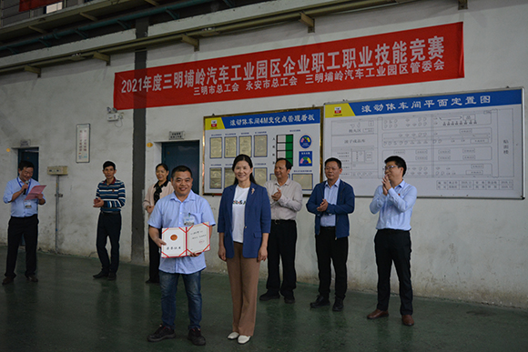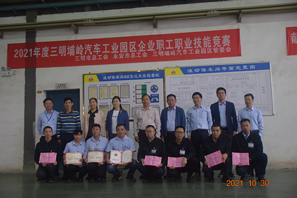 ▲三明市總工會(huì)、永安市總工會(huì)、三明埔?guī)X汽車工業(yè)園區(qū)管委會(huì)領(lǐng)導(dǎo)及龍軸集團(tuán)永軸公司領(lǐng)導(dǎo)班子與獲獎(jiǎng)選手合影留念