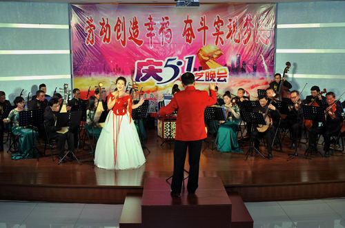 當(dāng)晚,公司俱樂部燈光璀璨,樂聲歡騰。隨著強(qiáng)勁的鼓點(diǎn)響起,開場舞《騰龍鼓樂》拉開了整場晚會的序幕,隨后,公司“老”歌手曾艷輝及團(tuán)委組建的舞蹈隊(duì)帶來了精彩的歌伴舞《雙腳踏上幸福路》,“新”歌手張錚聲情并茂地演繹了歌劇《江姐》選段《我為共產(chǎn)主義把青春貢獻(xiàn)》及民歌《桃花紅杏花白》,龍通藝術(shù)團(tuán)的歌手李紅英、吳罕帶來的獨(dú)唱《好日子》、《我愛你中國》喜慶激昂,羅斌峰的笛子獨(dú)奏《牧民新歌》及樂團(tuán)現(xiàn)場演奏的《龍江歡歌》、《紅樓夢插曲》、《蘇南小調(diào)》余音繞梁,男歌手熊凱、溫?zé)ㄕ竦哪新暘?dú)唱《格桑梅朵》、《懷念戰(zhàn)友》、《駿馬奔馳保邊疆》、中央民族大學(xué)聲樂碩士郭源源為大家?guī)淼摹逗oL(fēng)陣陣》、《一杯美酒》大氣悠揚(yáng)。