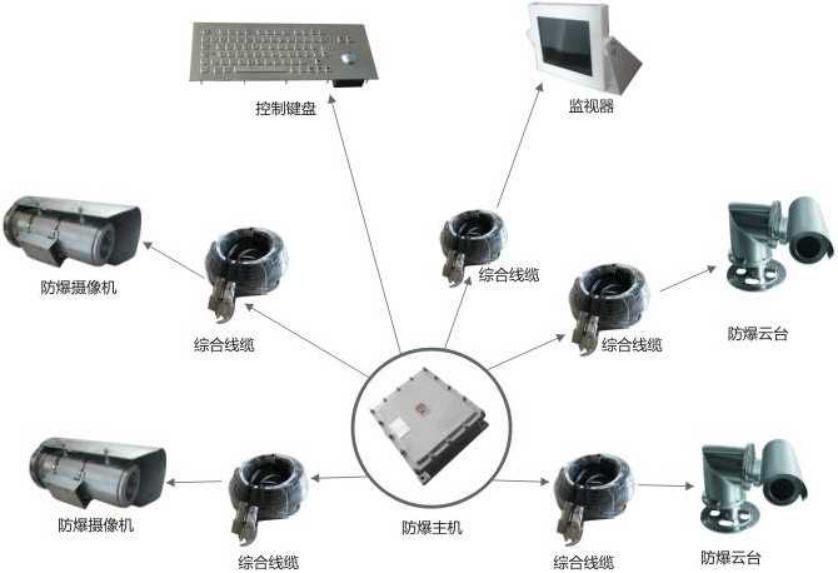 前端視頻采集點釆用我公司的BNK-2系列防爆攝像儀(該攝像儀為不銹鋼材質,內置高清一體化攝像機可選碳鋼),其中固定點部分采用能調節的支架,移動點部分采用全不銹鋼防爆電動云臺。